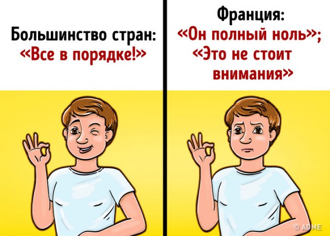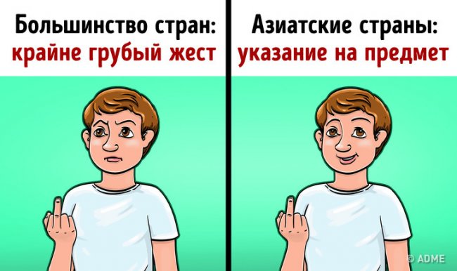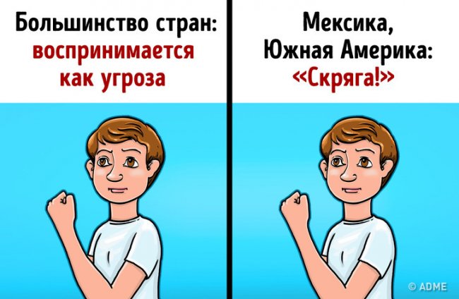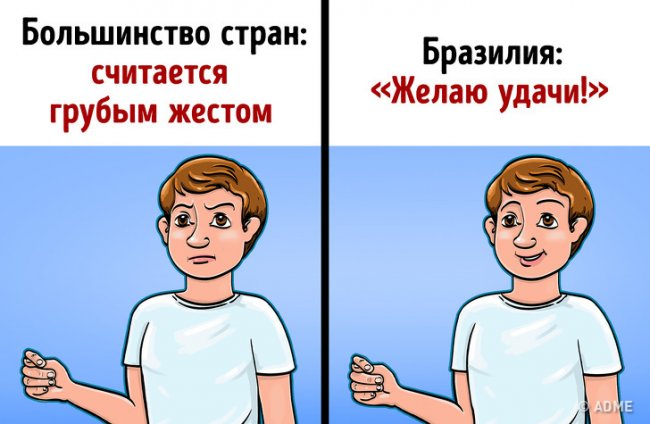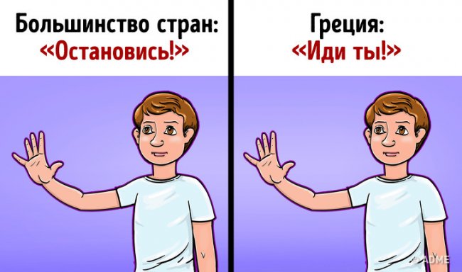Знаете ли вы, что привычные нам жесты в других странах могут быть истолкованы совсем по-другому? Как, например, поднятый кверху большой палец, который у нас означает: "Все классно!". В Греции, Таиланде, Афганистане, Иране его показывают, когда хотят отправить собеседника куда подальше, пишет AdMe.ru.