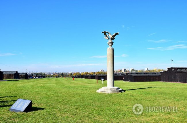 Колонна трех орлов. Монумент, построенный весной 1943 года на III поле польским политическими заключенными по приказу руководства лагеря, как элемент "облагораживания" территории. Благодаря тому, что зодчие тайком захоронили останки узников в фундаменте монумента, он стал первым памятником жертвам Майданека
