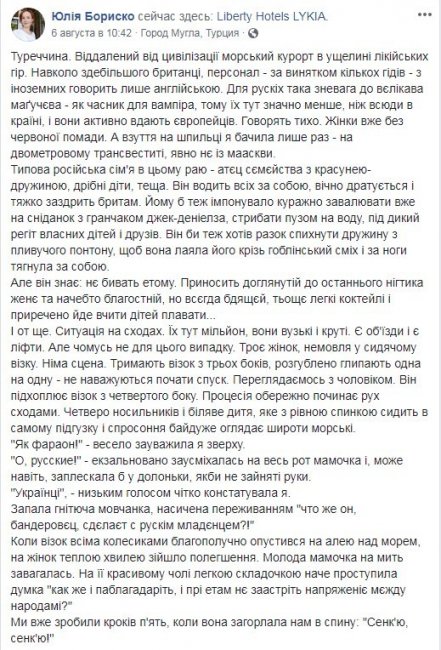 Украинская журналистка Юлия Бориско рассказала, как приструнила русских туристов в Турции. Женщина описала ситуацию, которая произошла с ней в одном из небольших курортных городов.