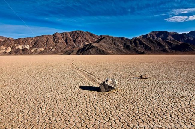 Эти камни и задали ученым еще одну загадку. Дело в том, что камни неведомым образом… передвигаются, оставляя за собой четкие следы перемещения. Люди в этом районе не живут, а исследователям угрожает только безжалостное солнце и отсутствие воды.