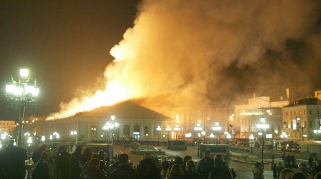 В воскресенье, 14 марта 2004 года, в России проходили очередные президентские выборы. В 21:14 в чердачных помещениях Манежа начался пожар. Площадь возгорания составила более 2000 м2. К полуночи от памятника русской архитектуры остался один обгоревший остов: кровля и торцевые стены Манежа были разрушены.