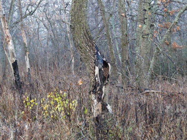 Многие деревья основательно обожжены. Большинство — в нижней части ствола, но у некоторых растений выжжена вся сердцевина, в отдельных случаях от массивного дерева оставался лишь обугленный пенёк.