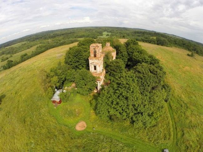 Полуразрушенная церковь Вознесения Господня в бывшем погосте Каменка, ранее село Грибаново, ныне деревня Каменка Локнянского района.