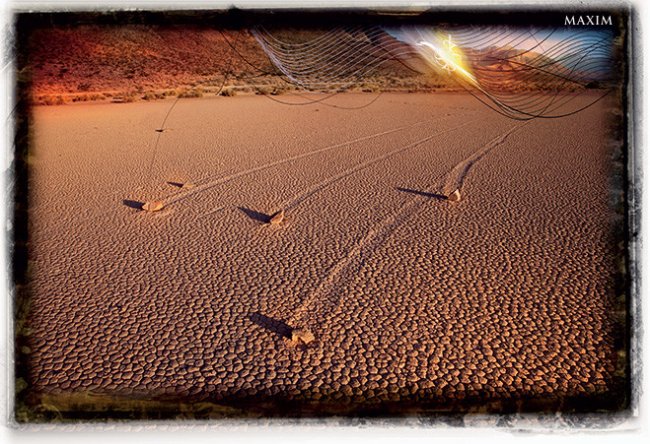 Американский штат Калифорния знаменит не только своим губернатором, но и одноименной пустыней (одноименной со штатом, а не со Шварценеггером). В этой и без того бесприютной пустыне есть совсем уж пустынная пустыня, называемая Долиной Смерти. В самом дальнем углу этого зловещего места находится высохшее озеро Рейстрек-Плайя. Со второй частью названия все относительно понятно: по-испански «playa» — «берег». Этим словом в Штатах обозначают пересыхающие в летний сезон озера, от которых ничего, кроме берега, и не остается. А вот «racetrack» — слово уже вполне английское, переводится как «гоночная трасса». Высохшие озера с гладкой поверхностью часто используют американцы для гонок на экспериментальных машинах, которые при их безумных скоростях полиция не пускает на шоссе. Но Рейстрек-Плайя с испещренным трещинами глинистым дном для гоночных целей совсем не подходит.