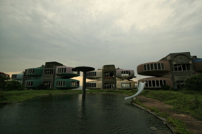Тайванский курорт Сан-Чи строился в 1970-х годах. Постройка осуществлялась в нарочито космическом стиле и была связана со сложными технологиями, оказавшимися не под силу многим рабочим. В связи с этим смертельных случаев на стройках было немало. Окончательно забыть об амбициях застройщиков заставил кредитный кризис начала 1980-х годов, после чего футуристические постройки Сан-Чи решили демонтировать, и смертельные ЧП возобновились. Видимо, вспоминая о Вавилонской башне, суеверные китайцы решили больше не гневить бога и оставили все как есть.
