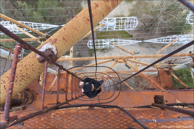 На самый верх мы не полезли из-за нехватки времени, но несколько пролетов все-таки осилили. На фото Виталик — покоритель ЗГРЛС )