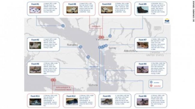 До находки в прошлое воскресенье последней найденной загадочной ступней являлась ступня, обнаруженная в декабре 2017 года. Как следует из выпущенной тогда же схемы, чаще всего оторванные/отрезанные ступни находили на берегу возле города Суррей, там было найдено 4 ступни. В остальных местах Британской Колумбии находили по 1-2 ступни.
