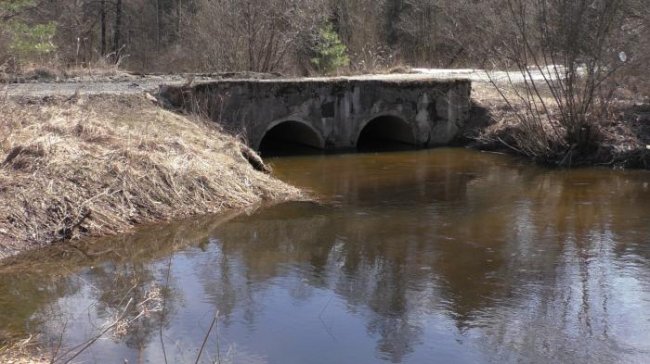 Кстати, выглядит он весьма заурядно: это бетонная труба под наезженной сельской дорогой, через которую течет небольшая речушка Песочня. Место тихое, спокойное. Летом здесь любят купаться дети.