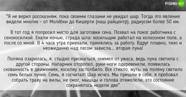 В 1983 году о Молёбке стало известно всей стране: пермский геолог, Эмиль Бачурин, во время зимней охоты обнаружил круглый след, диаметром 62 метра. После этого открытия в Молёбку приехала экспедиционная группа по аномальным явлением под руководством кандидата технических наук Эдуарды Ермилова. Участники группы опросили местных жителей и выявили, что место здесь и впрямь аномальное: тарелки летают, шары крутятся, люди ведут себя тревожно. Приводим вам свидетельство ядерщика с 20-летним стажем, Павла Гладышева, уроженца Молёбки, который после ухода в отставку вернулся в деревню: