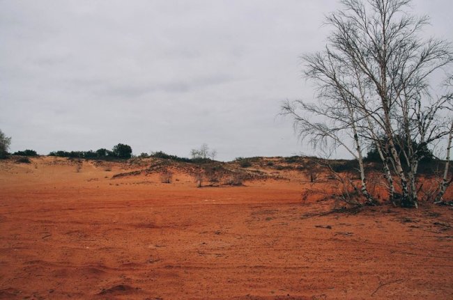 Песчаная зона находится в котловане или кратере. По окраинам расположились высокие, стройные березы, богатая растительность, чуть ниже – редкие деревья, словно карликовые, клонящиеся к земле. Недалеко отсюда протекает речка Чертолейка.