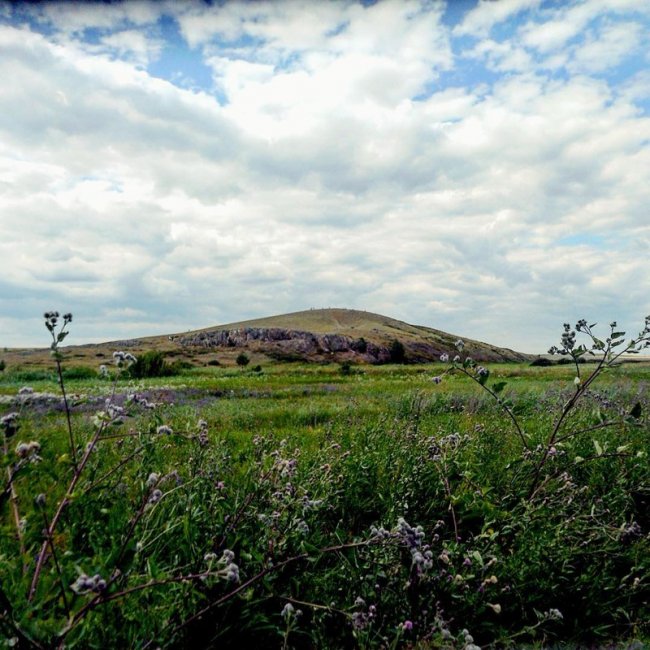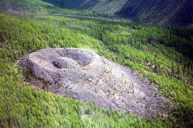 Ну вот и откуда, скажите на милость, посреди Тайги образовалась вот такая каменная гора с отрезанным верхом? Версий тут множества: от секретных «гулаговских» шахт до самопроизвольного ядерного взрыва урановых руд в недрах. Якуты сравнивают этот кратер с орлиным гнездом, в центре которого лежит каменной яичко, метров 40 в диаметре.