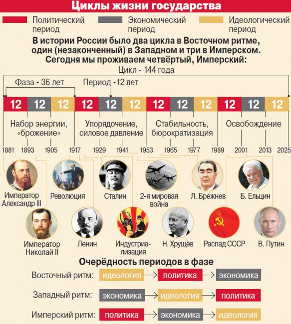 Четвёртый Имперский цикл начался в России в 1881 г. Вне зависимости от того, каким ритмом живёт страна, первая фаза — это всегда брожение, набор энергии. В конце первой фазы мы пережили революцию 1917 г. Во второй, «силовой» фазе, как и предначертано историей, у власти оказались харизматики -Ленин и Сталин. Причём неважно, белые, красные, — гайки в это время закручивал бы любой лидер. Кстати, харизматиками вторых фаз в истории России в разные циклы были Александр Невский и Иван Грозный. Тем временем итогом третьей фазы (такой же «блёклой», как и первая) в нашем нынешнем цикле стал распад СССР.