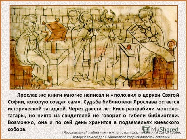 Ярослав сел на киевский престол в 1019 г., после победы над Святополком Окаянным на реке Альте, и заслуженно «утёр пота со своею дружиною». Теперь он мог всей душой отдаться любимому книжному делу.