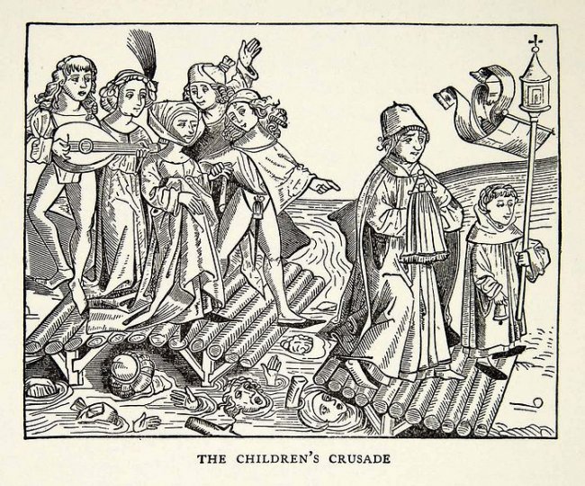 Летом 1212 г. по дорогам Франции и Греции двигались небольшими группами и целыми толпами мальчики от 12 лет и старше, одетые по-летнему: в простых холщевых рубахах поверх коротких штанов, почти все босиком и с непокрытыми головами. У каждого спереди на рубахе был нашит матерчатый крест красного, четного и зеленого цвета. Это были юные крестоносцы. Над процессиями веяли пестрые флаги; на одних было изображение Иисуса Христа, на других — богородицы с младенцем. Звонкими голосами крестоносцы распевали религиозные гимны, прославляющие бога. Куда же и с какими целями направлялись все эти толпы детей?