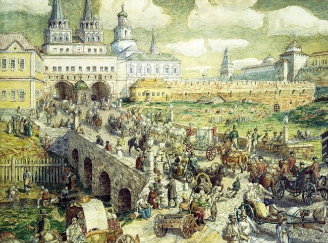И представления о “сонном царстве”, замкнутом в пределах натуральных хозяйств, тоже рассыпаются в прах. Напротив, возникает впечатление, что Русь пребывала в постоянном движении! Каждую весну десятки тысяч дворян и детей боярских с обслугой, казаков, отправлялись из дома к южной границе. А осенью — обратно. А раз в 2–3 года — в Москву, на очередной смотр. То есть проехаться верхом, а то и пройтись пешочком откуда-нибудь из Костромы до Курска было для россиян вполне заурядным делом. По дорогам постоянно двигались туда-сюда ямщики, шли паломники в далекие монастыри. А зимой начинались интенсивные перевозки сданных налогов, оброков, товаров на рынки. И Ченслер по дороге из Ярославля писал: “Земля вся хорошо засеяна хлебом, который жители везут в Москву в таком количестве, что это кажется удивительным. Каждое утро вы можете видеть от 700 до 800 саней, едущих туда с хлебом, а некоторые с рыбой”. Вот вам и “сонное царство”!