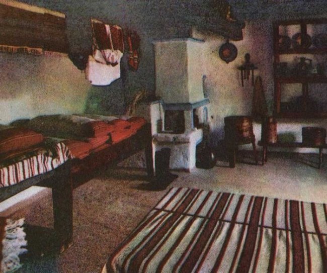 Обычно плотники делали и “нутрь” — меблировку дома. Угол возле печи являлся рабочим местом хозяйки, его называли “бабий кут”. Здесь же обязательно располагался рукомойник из меди или керамики и лохань. А угол по диагонали от печи был “красным”, там висели иконы, он считался самым почетным местом. В типичный интерьер входили стол, полка для посуды, сундуки, лавки и скамьи (они отличались тем, что скамьи можно было передвигать, а лавки крепились к стене намертво). Семьи были большие, из трех поколений — стариков, их женатых детей и внуков. И ничего, уживались все вместе. Старики спали на печи, малышня — на пристроенных к ней полатях, а взрослые по лавкам. Летом становилось просторнее — хозяева ночевали в повалуше, а законным местом молодоженов считался сеновал.