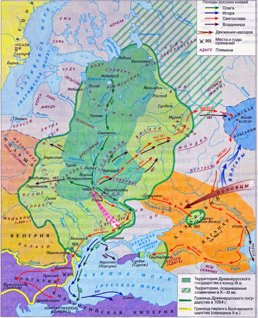 Русское государство в начале X в. При Олеге Вещем не только создалось единое русское государство, простирающееся от Ладоги до Киева: это государство выступило как полноправный участник, «субъект» исторического бытия громадного евразийского региона, в котором действовали три мощных империи — Византия, Хазарский каганат и Арабский халифат