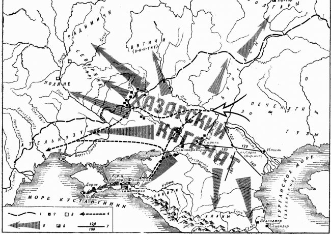 Хазария в VIII–IX вв. Условные обозначения: 1 — границы леса с лесостепью; 2 — хазарские крепости и города VIII–IX вв.; 3 — русские города IX–X вв.; 4 — путь печенегов по южнорусским степям в конце IX в.; 5 — направления экспансии Хазарского каганата в VIII–IX вв.; 6 — столица Волжской Болгарии; 7 — расстояние от летней ставки кагана на реке В-р-шан до границ личного домена. Публикуется по книге Плетневой С. А. Хазары
