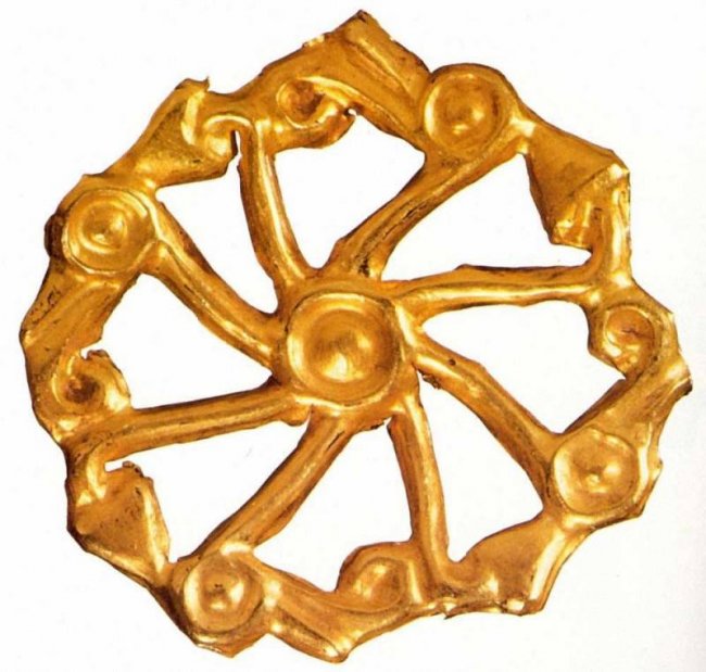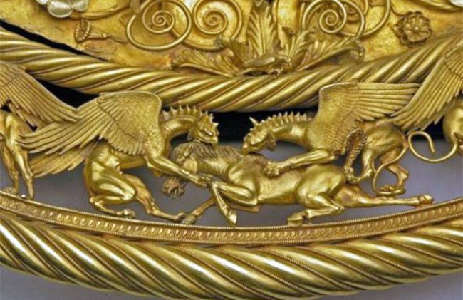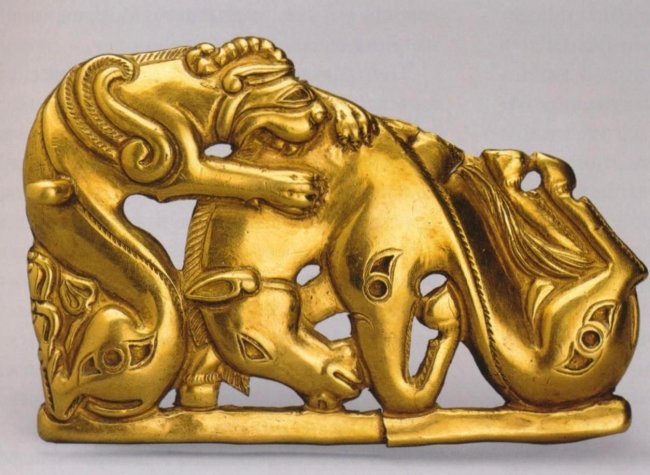 Более того, скифы из этого благородного металла создали целый культ. Золото применяли в быту, обильно украшали драгоценными бляшками одежду и обувь, покрывали военную амуницию, конскую сбрую и, совершенно не жалея, закапывали огромное количество золотых украшений вместе с умершими. Приверженность скифов к золоту являлась их странной, удивительной особенностью. Тот же Геродот писал, что серебро и медь этим народом употреблялись в ограниченных количествах, а предпочтение они отдавали исключительно золоту. И действительно, археологические находки показывают: ни до, ни после скифов этот металл не был так распространен в степном регионе нынешней Украины. Ни одна другая культура древности, даже «богатые золотом Микены», не могли в этом отношении соперничать со Скифией. Золото у этого степного народа считалось символом богатства, олицетворяло огонь, солнце, царскую власть и, что самое главное, вечную жизнь. Чтобы покрыть им как можно большую площадь тела, скифские мастера разработали специальную технологию — ручную вытяжку золотой фольги и чеканку из нее бляшек с оригинальными изображениями.