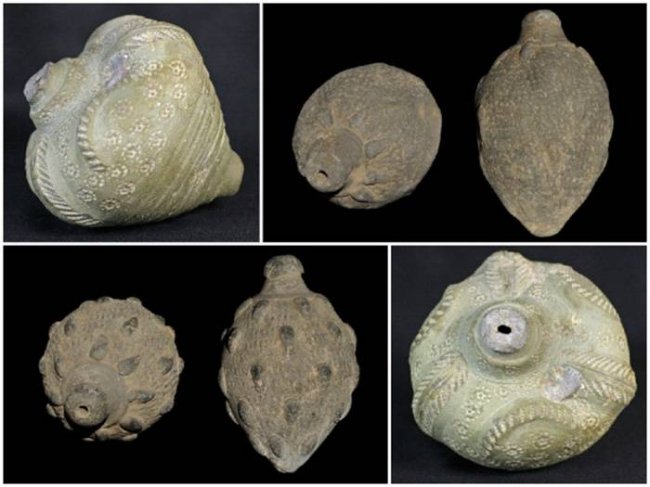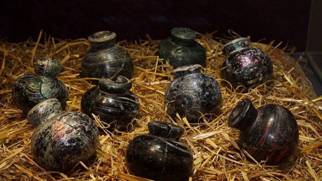 Более ста почти неповрежденных ручных гранат из дутого стекла, в некоторых из которых сохранились и фитили. Археологический музей Митилини, Лесбос.