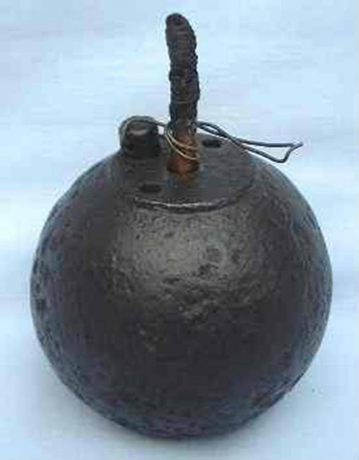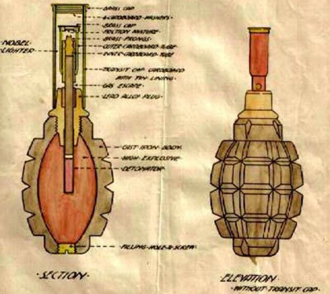 Английская «шаровая» граната №15 образца 1915 года. Чугунный корпус диаметром 3 дюйма, с внутренними насечками для фрагментации заполнялся черным порохом или аммоналом. Запал гранаты №15 представлял собой типичный терочный запал, который разработал конструктор Брок. Запал был очень чувствителен к сырости и часто отказывал, поэтому часто заменялся куском бикфордова шнура.