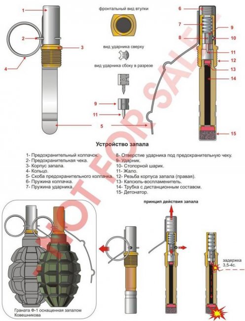 В начале Великой Отечественной войны гранаты снаряжались вместо тротила даже черным порохом. Граната с такой начинкой вполне эффективна, хотя и менее надёжна. После Второй мировой войны на гранатах Ф-1 стали применять модернизированные более надежные запалы УЗРГМ и УЗРГМ-2.