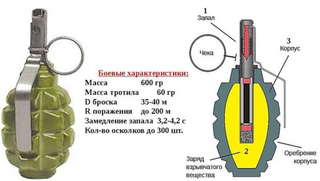 Ручная граната F1 была довольно технологичной, не требовала дефицитного сырья, несла умеренный заряд взрывчатого вещества и в то же время обладала большой мощностью и давала большое по тем временам количество убойных осколков. Пытаясь решить задачу правильного дробления корпуса при взрыве, конструкторы использовали глубокую насечку на корпусе. Однако боевой опыт показал, что при современных бризантных ВВ корпус такой формы при взрыве дробится непредсказуемо, причем основное количество осколков имеет малую массу и малоубойны уже в радиусе 20-25 метров, в то время как тяжелые осколки донца, верхней части гранаты и запала имеют высокую энергию за счет своей массы и опасны до 200 м. Поэтому все утверждения насчет того, что насечка имеет своей целью образование осколков по форме выступающих ребер, как минимум, неверна. То же самое следует сказать и насчет явно завышенной дистанции поражения, так как дальность сплошного поражения осколками не превышает 10-15 метров, а эффективная дальность, то есть такая, где хотя бы половина целей будет поражена – 25-30 метров. Цифра 200 метров – это не дальность поражения, а дальность безопасного удаления для своих частей. Потому метать гранату следовало из-за укрытия, что было вполне удобно в случае позиционной войны.