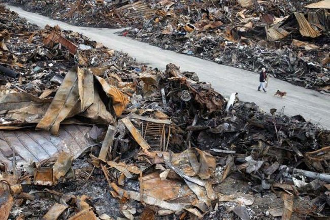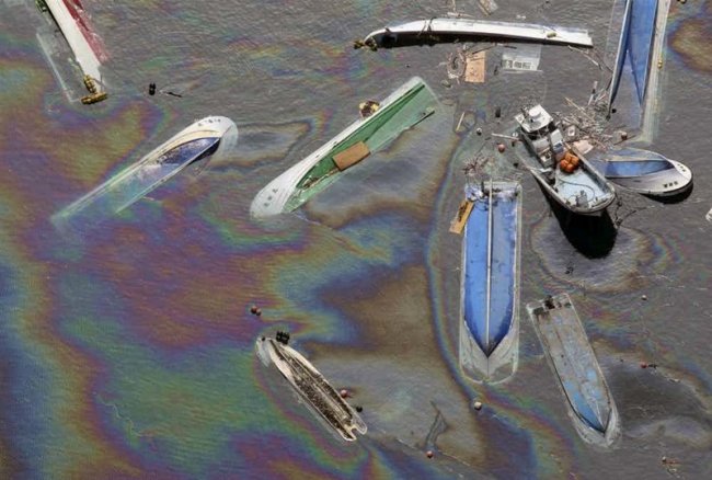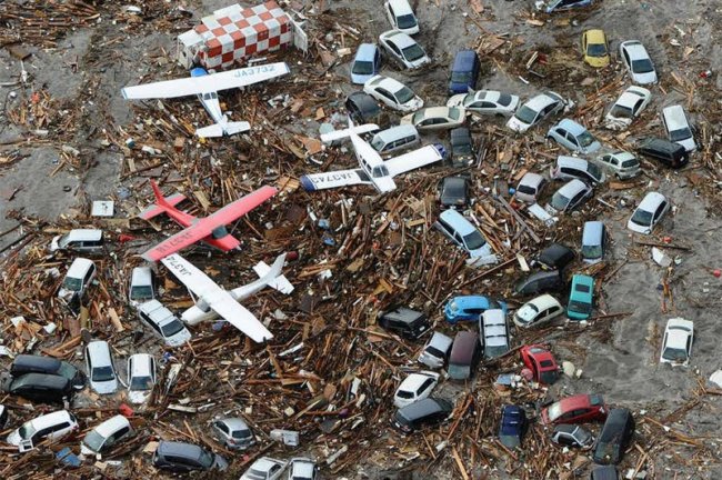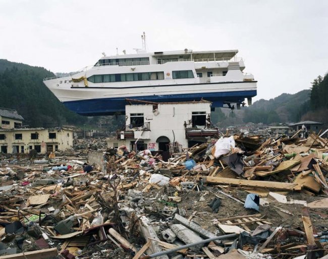 Цунами перевернуло и разбило в щепки тысячи рыбацких лодок и катеров. Топливо из них, разумеется, выливалось в море, дополняя картину экологической катастрофы. Вот так выглядела акватория у деревни Фудаи, где цунами разметало все рыболовецкие суда. Очистка моря от нефти стала второй главной экологической задачей японцев во время восстановления страны — после ликвидации аварии на атомной станции Фукусима, тоже вызванной цунами..