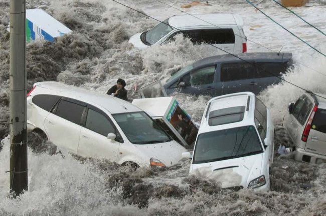 На снимке — Тоя Шиба, репортер местной газеты «Ивате Токаи Синбун», делавший репортаж о цунами в портовом городе Камаиши. Через несколько секунд его смоет волна. К счастью, Шиба выжил, сумев ухватиться за свисающую веревку и выбраться по ней на высокое место.