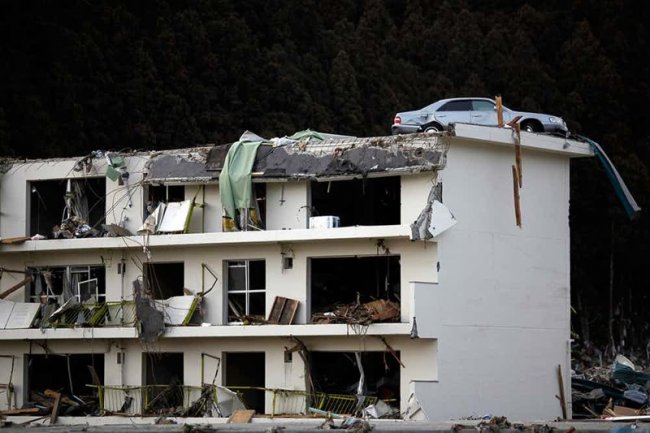 Могучая волна цунами легко поднимала тяжелые машины на высоту 3-5-этажного дома. Это — снимок из города Мирамисанрики. По месту нахождения автомобиля видно, как высоко стояла в городе вода на пике цунами.