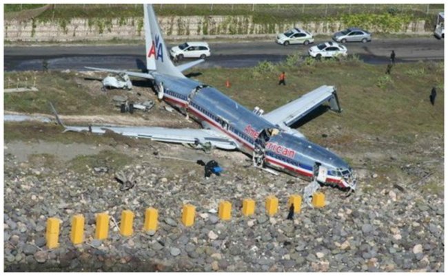 Сильный дождь привел к тому, что при посадке самолет сошел с полосы и сломался в трех местах. Все выжили.