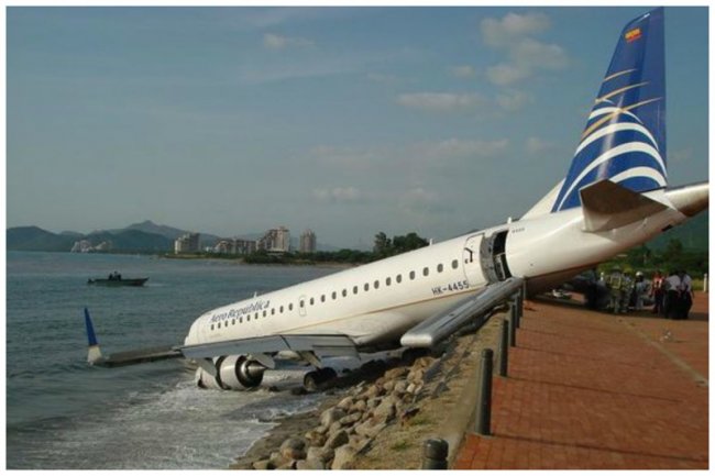 пределы взлетно-посадочной полосы, пробил по периметру ограждения, и соскользнул в море