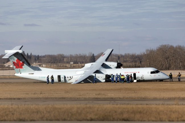 Air Canada после того, как он совершил аварийную посадку в Эдмонтоне, 7 ноября 2014 г. — сломанное шасси привело к тому, что самолет выехал с посадочной полосы. Все пассажиры живы