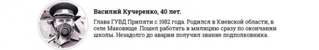 Скорая отправляет начальника милиции города Припять Василия Кучеренко в госпиталь МВД, где он получит II группу инвалидности. Его дочки, несмотря на полученные дозы радиации, останутся здоровыми.