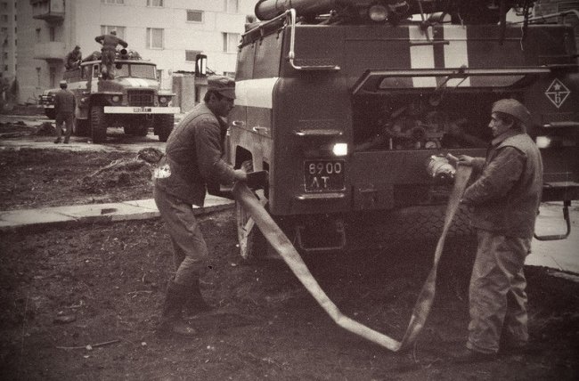 Пожарные приступают к тушению горящего энергоблока, не имея защиты от радиации. К месту аварии направлены расчёты общей численностью 69 человек и все машины скорой помощи города Припяти.