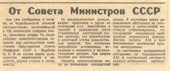 Москва. Информационное агентство ТАСС публикует сообщение только для зарубежных СМИ: «На Чернобыльской АЭС, расположенной на территории Украинской ССР рядом с границей Белорусской ССР, произошла авария. Погибло два человека. Последствия аварии ликвидируются, для установления причин случившегося создана правительственная комиссия».