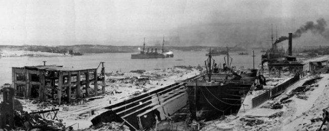 Эта жуткая история началась 25 ноября 1917 года, когда судно «Монблан» встало для загрузки в порту Нью-Йорка. На него погрузили жидкую и сухую пикриновую кислоту — 2300 тонн; тротил — 200 тонн, пироксилин — 10 тонн, бензол в бочках — 35 тонн. Судно направлялось в Бордо, а промежуточным пунктом в маршруте был канадский город Галифакс. Около 7 часов утра 6 декабря 1917 года «Монблан» начал заходить в порт. В это же время из порта начал выходить норвежский пароход «Имо». Когда суда сблизились, оба капитана стали совершать рискованные маневры, и в результате «Имо» протаранил «Монблан» в правый борт. На судне начался пожар, приведший к взрыву, в результате чего порт и значительная часть города были полностью разрушены. Около 2 000 человек погибли под обломками зданий и из-за возникших после взрыва пожаров. Приблизительно 9 000 человек получили ранения, 400 человек лишились зрения. Взрыв корабля «Монблан» считают мощнейшим взрывом доядерной эпохи.