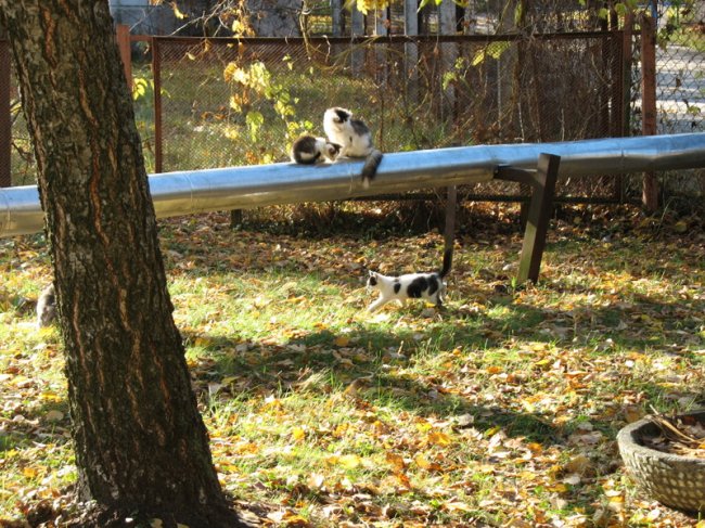 Останавливались возле Чернобыльинтеринформа (административное здание ЧЗО), там живности мурлычащей довольно много, а людей мало…