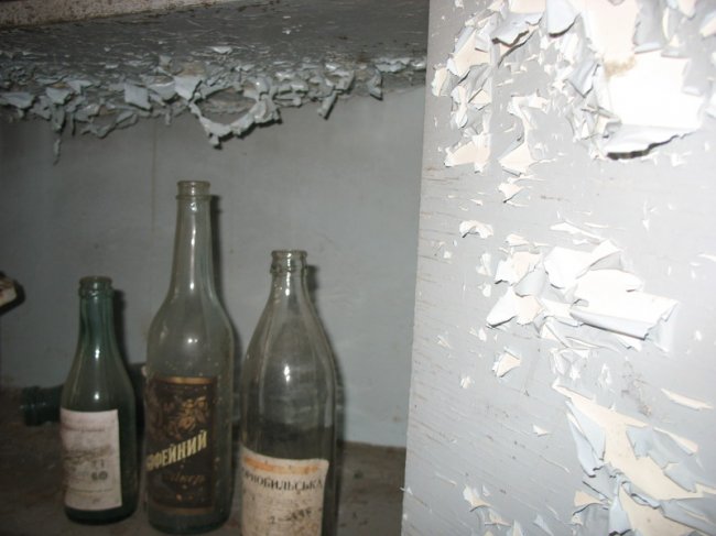 На переднем плане бутылка из под минеральной воды Чернобыльской, с датой изготовления 26.04.86 (на фото не видно, но поверьте — смотрел, так и есть!)