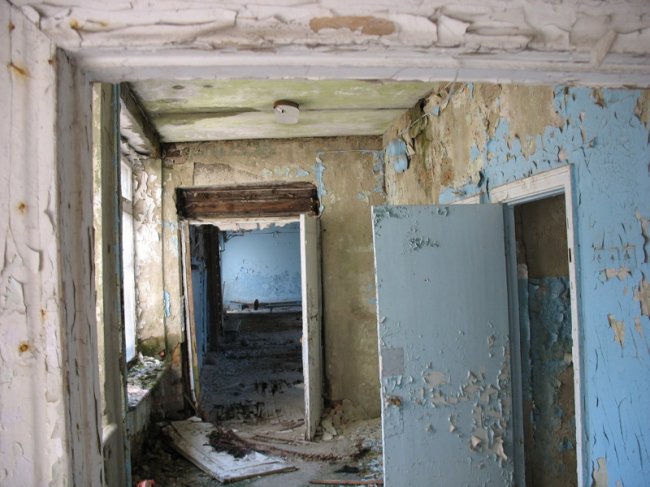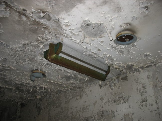 После эвакуации во всех зданиях сливы с крыш вывели или через чердаки, или, как в данном случае, через окна пятых этажей. Естественно мародёры эти трубы быстро посрезали и вода просто льётся внутрь помещений(( На самом переднем плане можно рассмотреть воронку от воды, а под окном себя очень замечательно чувствует папоротник.