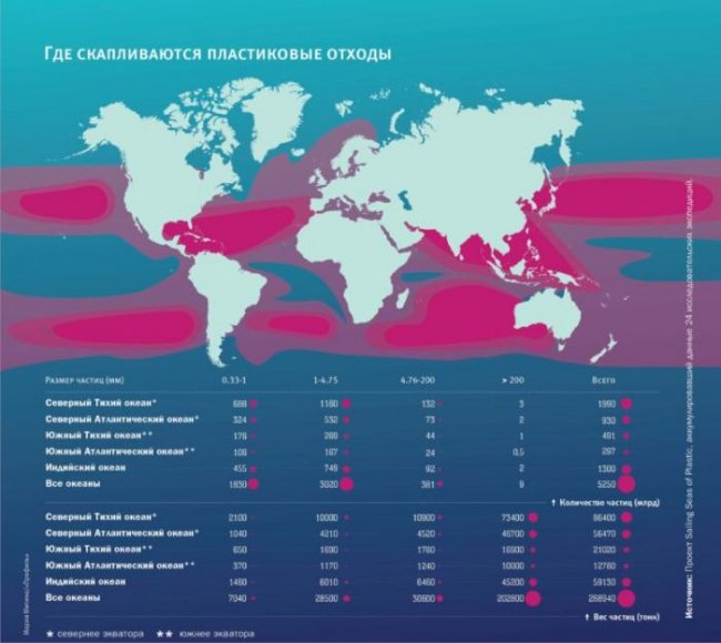 Океаны принимают на себя основной удар пластикового загрязнения: из-за круговорота течений в них образуются «мусорные острова» – по два в Атлантическом и Тихом (севернее и южнее экватора), один в Индийском. Сильнее всего ситуация запущена на севере Тихого: еще в конце 1980-х ученые предсказали появление мусорного пятна между Калифорнией и Гавайями, а в 1997-м его эмпирическим путем открыл яхтсмен Чарльз Мур, угодивший на своей яхте в самую гущу свалки.