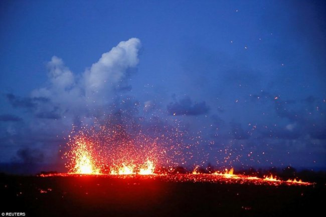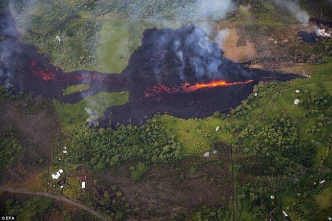 Извержение Килауэа продолжается уже 10 дней, к настоящему моменту зафиксировано около 20 вулканических трещин, из которых вытекает лава. Облака вулканического пепла при этом поднимаются в воздух почти на четыре километра.