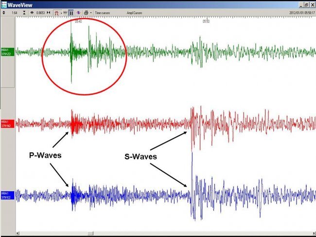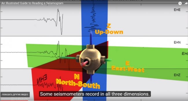 Все это сознает некоторую путаницу, тем не менее три цвета на сейсмограммах общепринятые, при этом датчик обычно пишет только вертикальные колебания и в зависимости от основного цвета понятно о какой системе обозначений идет речь. Но в случае с британской сейсмограммой все очень непонятно. Там отражены колебания поверхности в 12-ти измерениях? Или это 12 сейсмических станций, у каждой из которых свой цвет чернил? Очень похоже, что сейсмограмму просто нарисовали исключительно для газетных кретинов и к реальной записи сейсмического события эта висящая на официальном сайте хрень отношения не имеет.