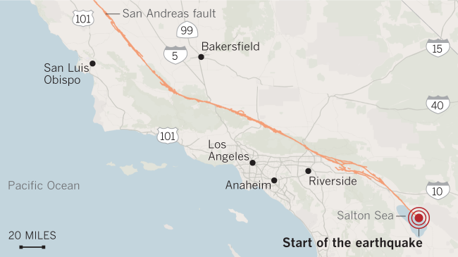 Удивленные журналисты спросили сейсмолога: как городу угрожает землетрясение, которое началось так далеко, ведь Солтонское море находится от Лос-Анджелеса более чем за сотню миль? Тогда специально для Los Angeles Times были продемонстрированы сейсмические карты и графики, в которых точками указывается эпицентр того или иного землетрясения: