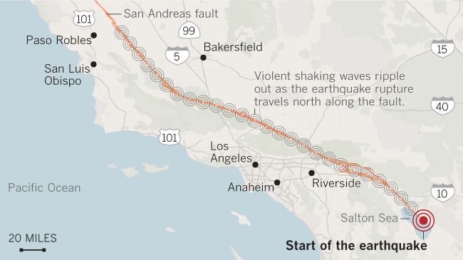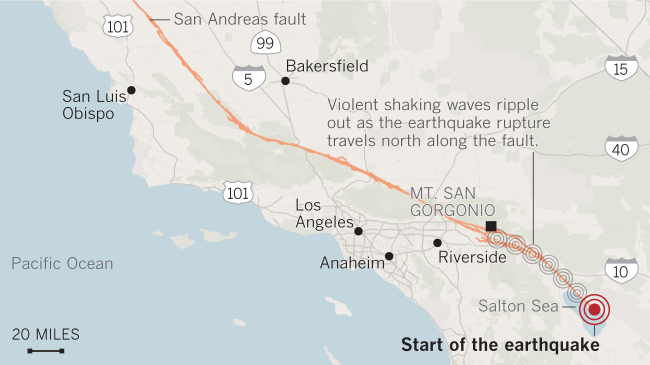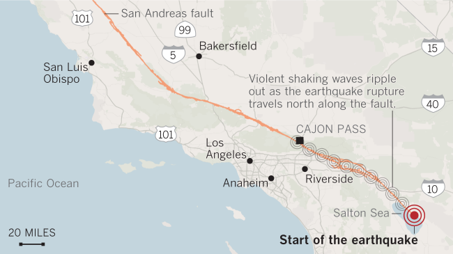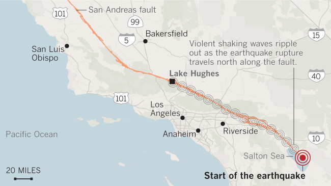 По словам Кейта Шарера, эпицентр в Солтонском море словно стреляет по Лос-Анджелесу сейсмической энергией. Если там будут толчки магнитудой 8.2, в Лос-Анджелесе будет 7.8.