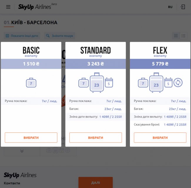 SkyUp предлагает билеты эконом класса по трем тарифам. Basic не подлежит обмену и возврату и включает перевозку только ручной клади 7 кг, Standard помимо ручной клади позволяет провозить один чемодан весом до 23 кг и менять билет со штрафом, Flex помимо услуг тарифа Standard включает возможность отмены билета после оплаты штрафа.