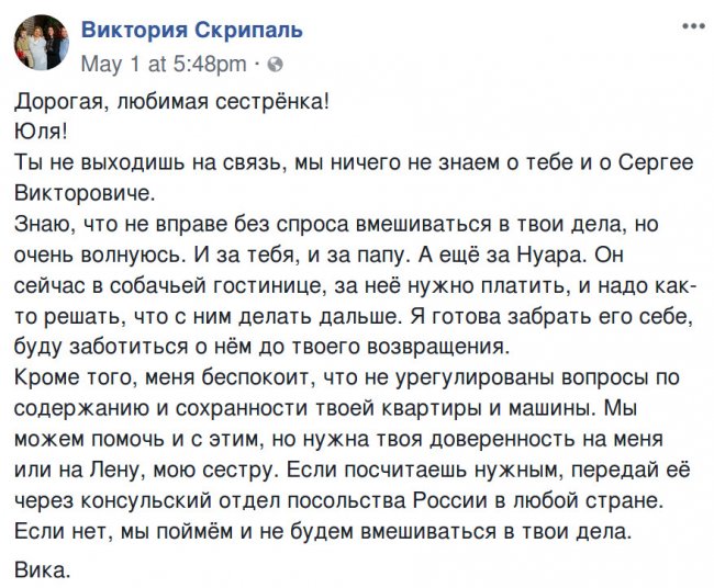 «Моя дорогая сестра, Юля! Вы не общаетесь с нами, и мы ничего не знаем о вас и Сергее Викторивиче. Я знаю, что я не имею права вмешиваться в ваши дела, не спрашивая вашего разрешения, но я слишком переживаю. Я беспокоюсь о тебе и твоем отце. Я также беспокоюсь о Нуар. [Нуар — собака Юлии Скриаль, которую она оставила, чтобы остаться в кинологическом центре, пока она едет в Великобританию.] Он сейчас в отеле для собак, и они хотят получить деньги. Мы должны решить, что с ним делать. Я готов взять его и позаботиться о нем, пока ты не вернешься домой. Помимо Нуар, я беспокоюсь о вашей квартире и вашей машине. Ничего не было принято в отношении их безопасности и обслуживания. Мы можем помочь со всем этим, но мне нужна ваша доверенность на имя моей или моей сестры Лены. Если вы считаете, что все это важно, составить форму доверенности в российском консульстве в любой стране. Если вы этого не сделаете, мы поймем и не будем вмешиваться в ваши дела.