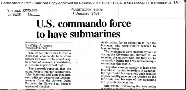 Поскольку ЦРУ располагает своими подводными лодками, статья Washington Times от 3 января 1985 года показывает, что две подводные лодки с баллистическими ракетами, USS John Marshall и Sam Houston были переданы Специальным оперативным силам численностью в 2000 человек.