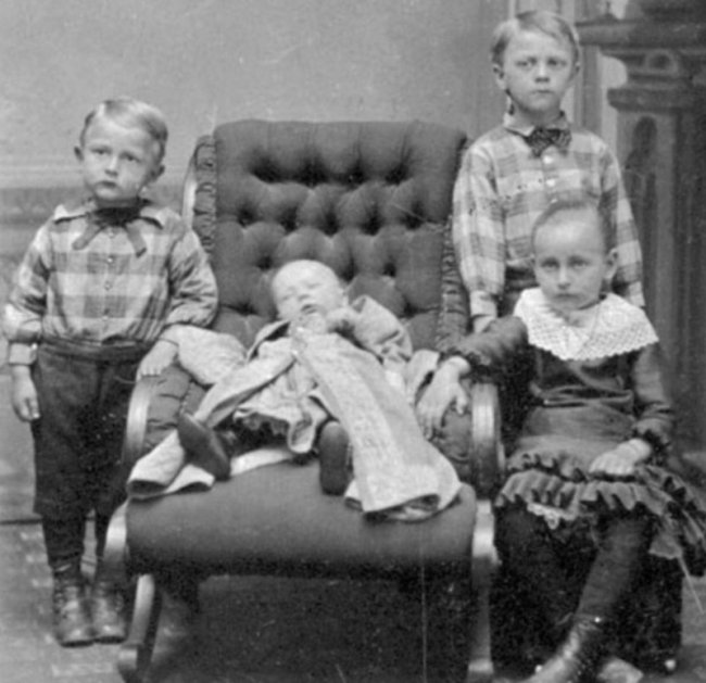 В то время на одну фотографию уходило от 30 секунд до 15 минут, и все это время нужно было сидеть рядом с покойником не шевелясь. Наверное, это было непросто – например, на этой фотографии рядом с мертвым малышом в кресле стоят старшие братья и рядом на стуле сидит сестренка. Тоже маленькие дети.