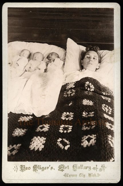 Так как фотография была делом дорогим, часто на одной фотографии объединяли сразу нескольких умерших в одно время людей, чтобы не тратиться на отдельный снимок для каждого. На этой фотографии изображены мать и ее тройняшки. К сожалению, и мать, и двое из троих детей мертвы – возможно, из-за какой-нибудь эпидемии.
